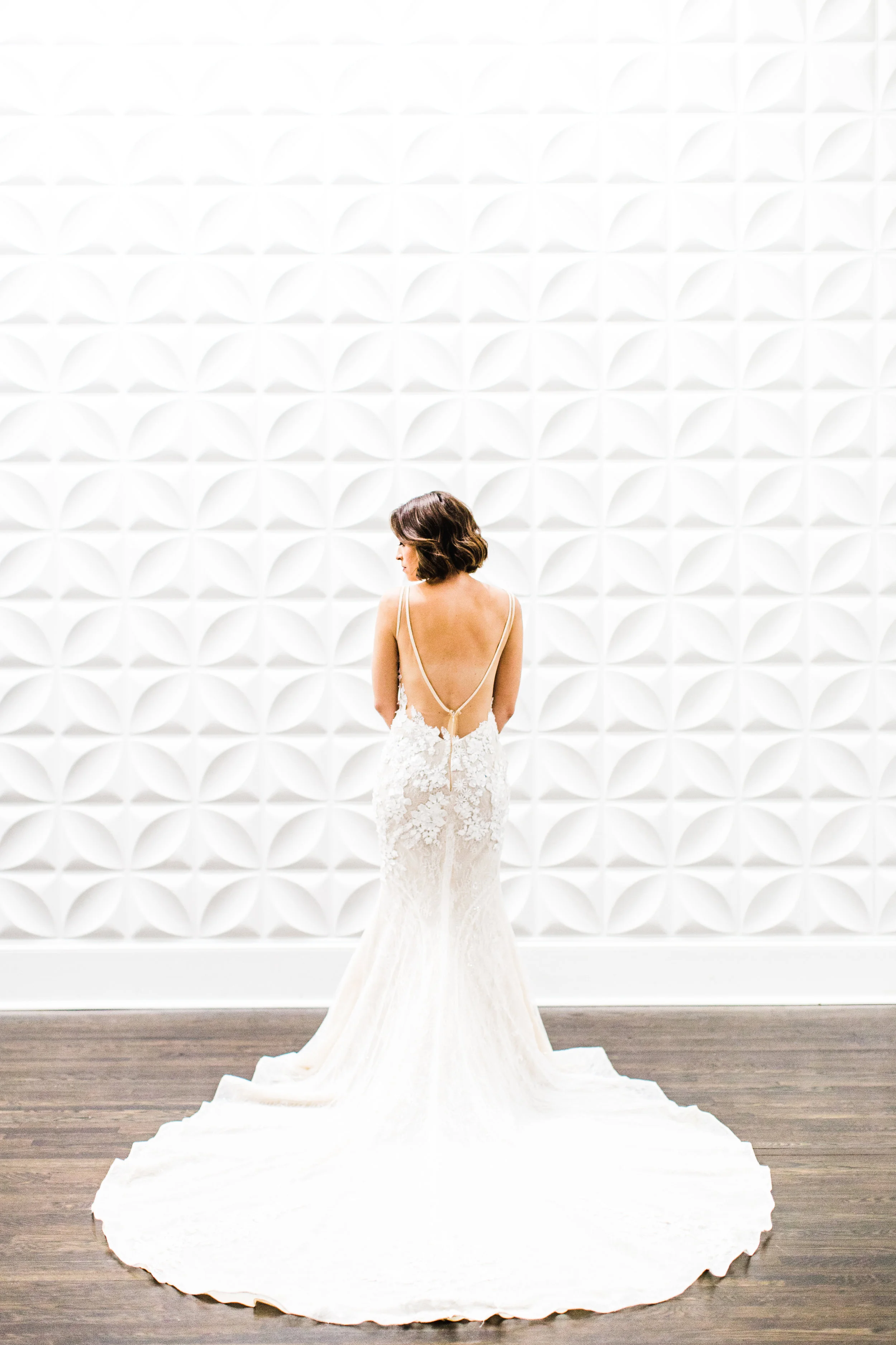 Open back and illusion gowns are the trickiest when it comes to bridal undergarments. If your gown has built-in support and you feel comfortable with its fit with no bra, then go for it! But, if you tend to need a bit more support or feel more at ease with your gown due to the revealing aspect of the silhouette, opt for an adhesive cup bra or a bra with a plunging back. This will hold you in place without exposing any straps in the back, front, or side of your gown. Don’t forget, if you choose to wear shape-wear, you have to make sure its waistline is in line with or below the back of your gown or illusion panels.